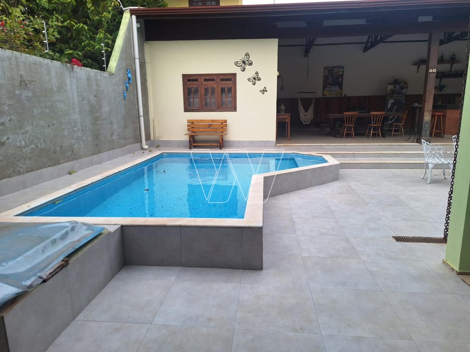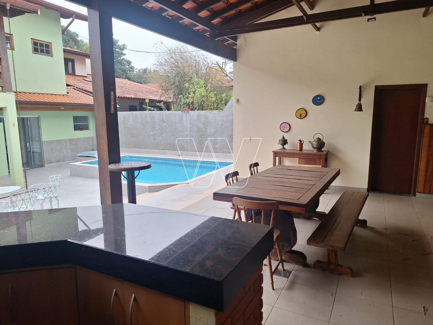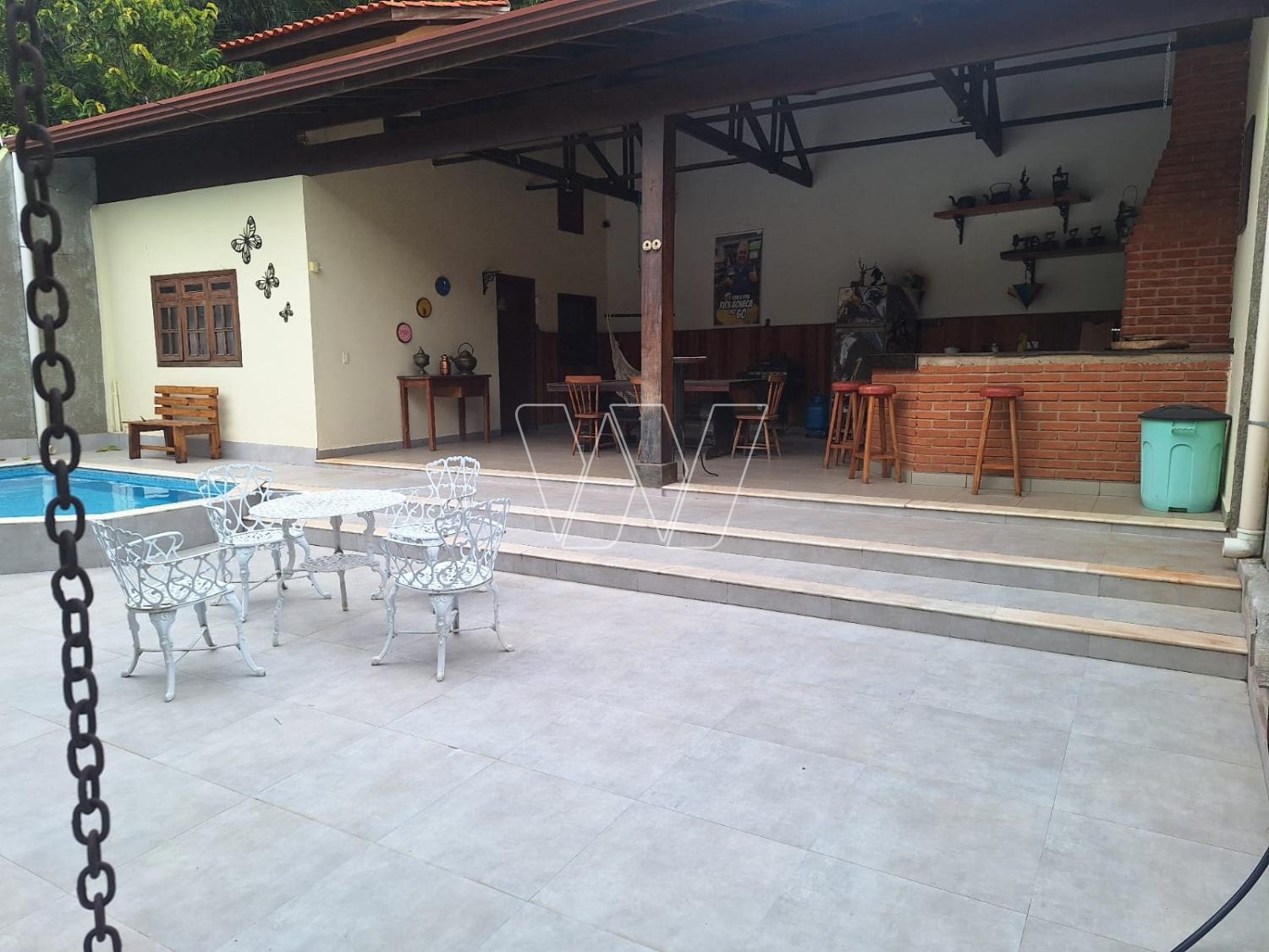 Areá externa: quintal com espaço gourmet: churrasqueira, forno e fogão a lenha, banheiro de apoio e piscina.