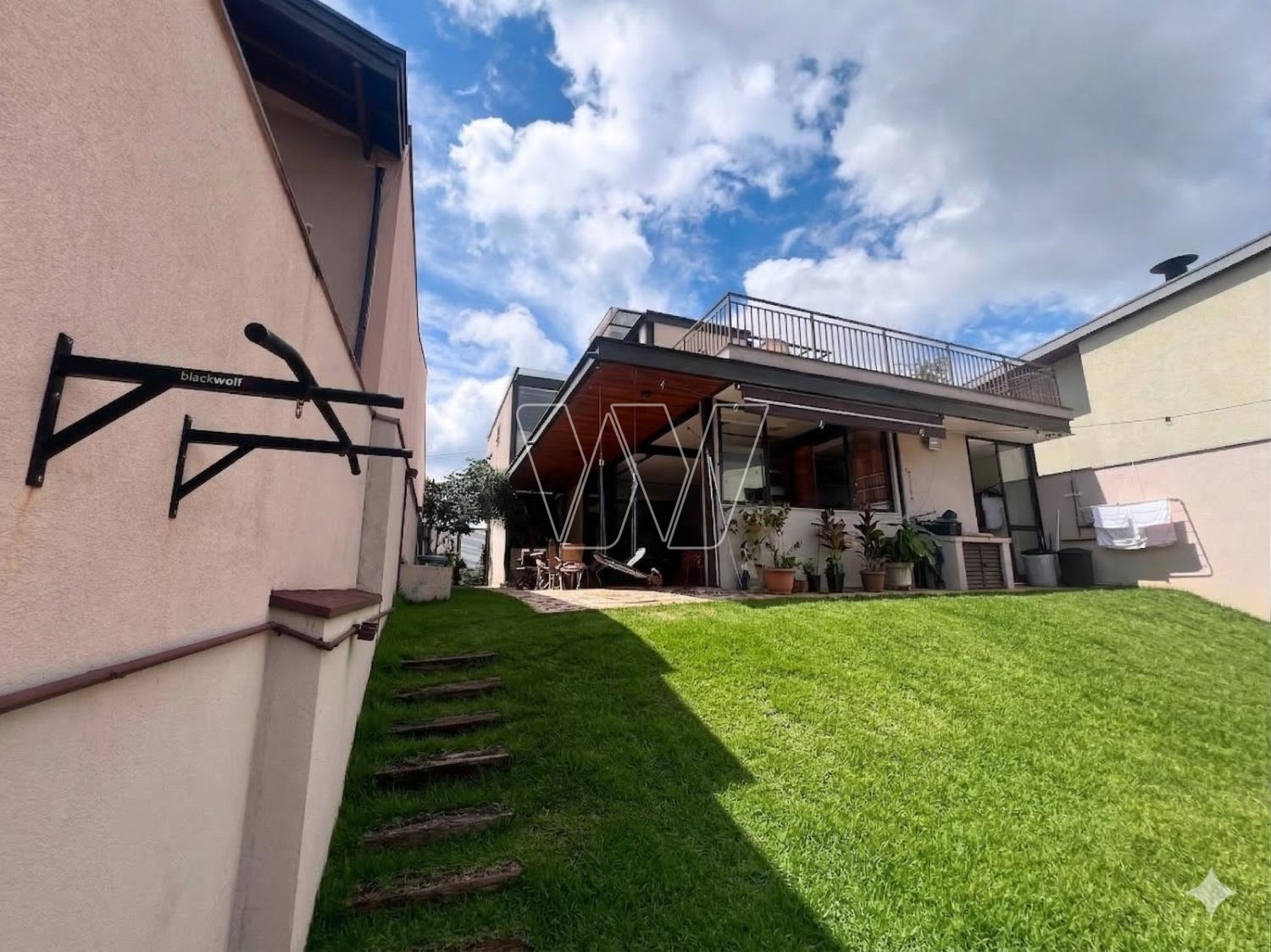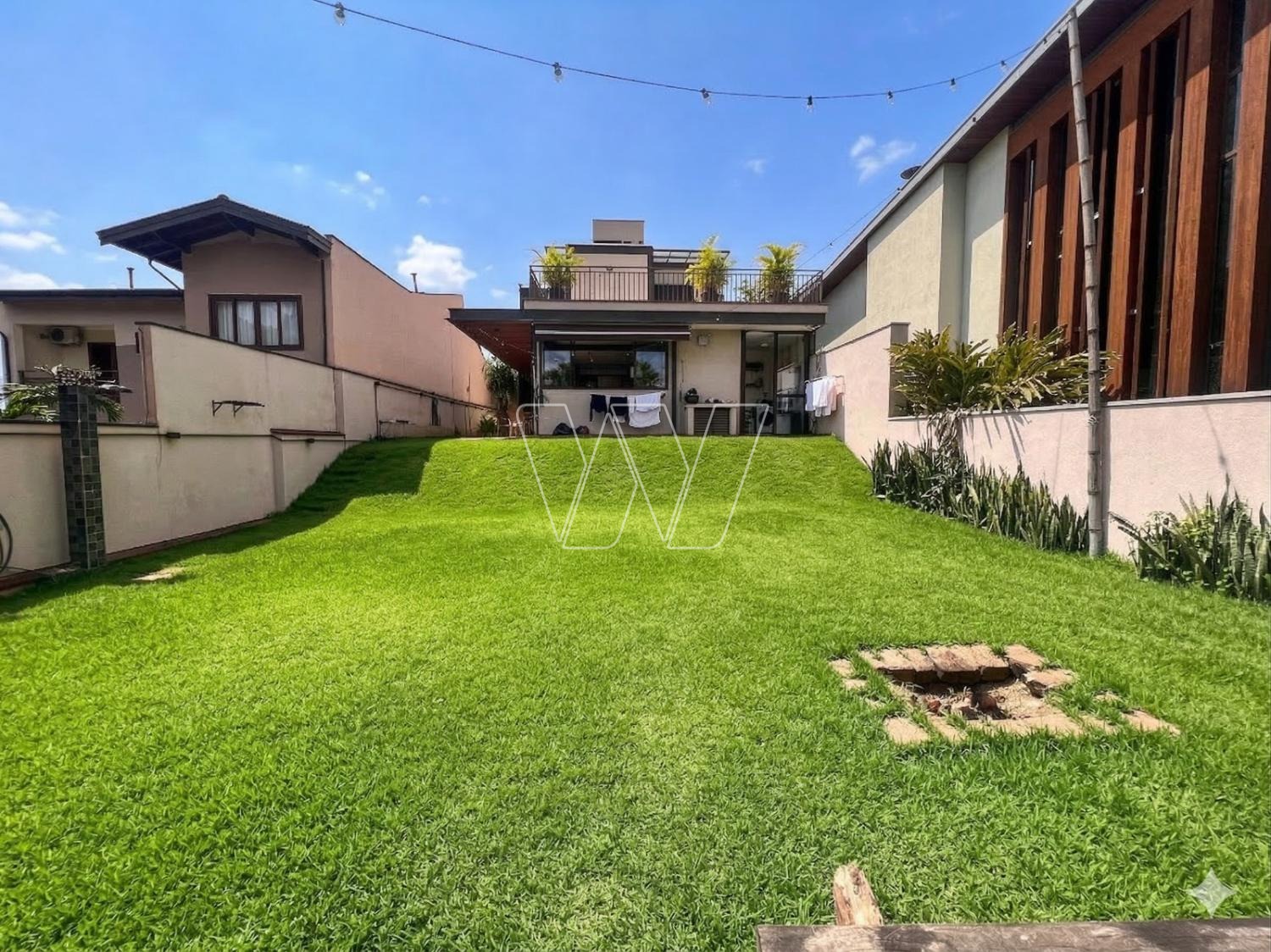 Quintal bem grande, todo gramado, tendo ao fundo mata de preservação do condominio, que pode ser explorado como pomar.