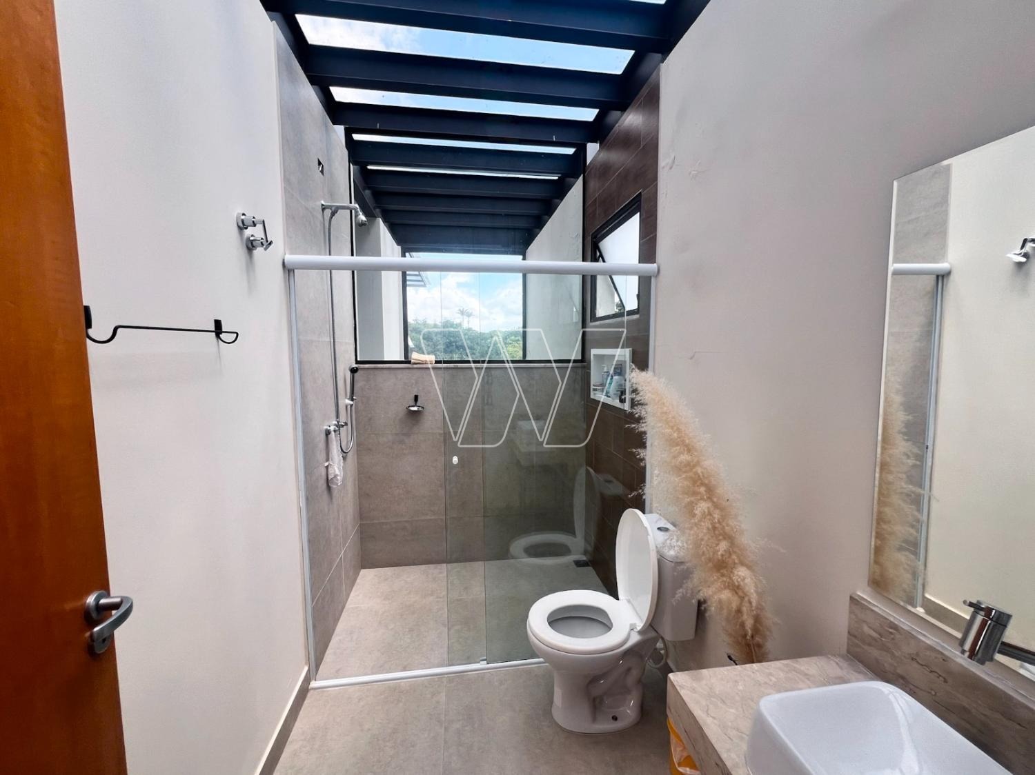 Construção moderna com toda a estrutura em vigas de aço, portas e janelas externas em aluminio preto, com a utilização de muito vidro, tornando a casa bem iluminada.