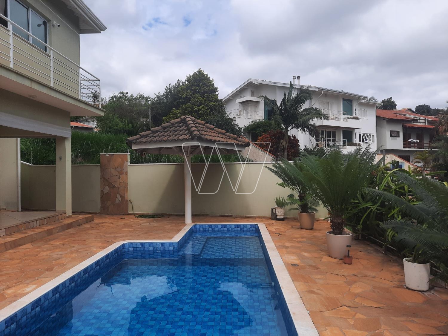 ÁREA INFERIOR DA CASA: varanda aberta com quarto de empregada, banheiro, quarto de depósito e piscina com quiosque.
