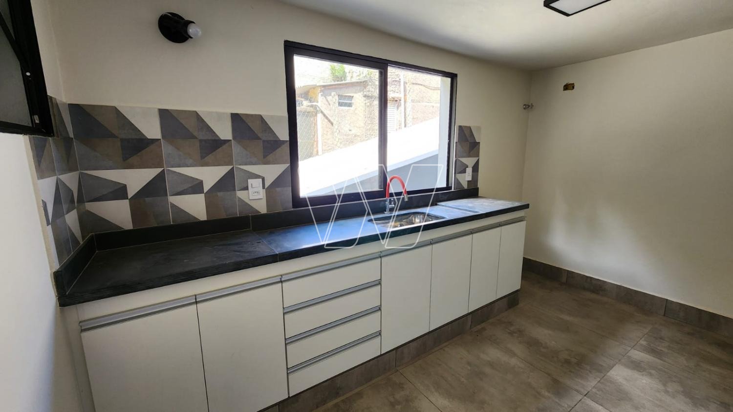 Cozinha americana e pequena lavanderia.