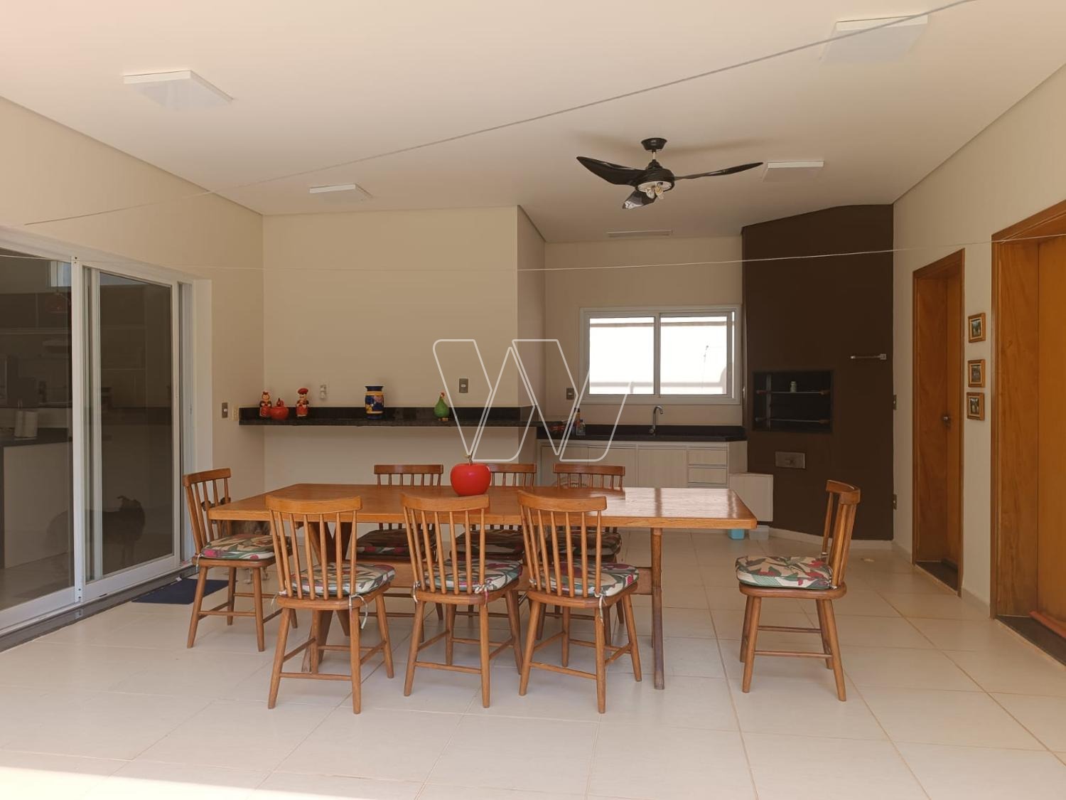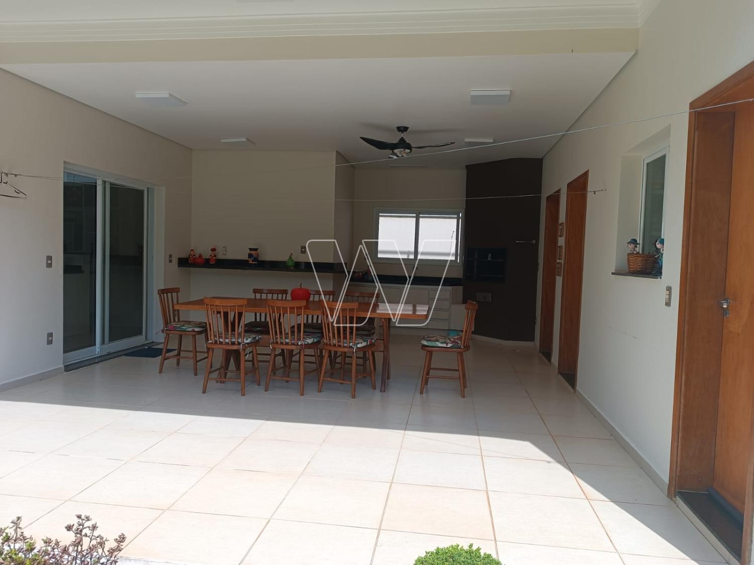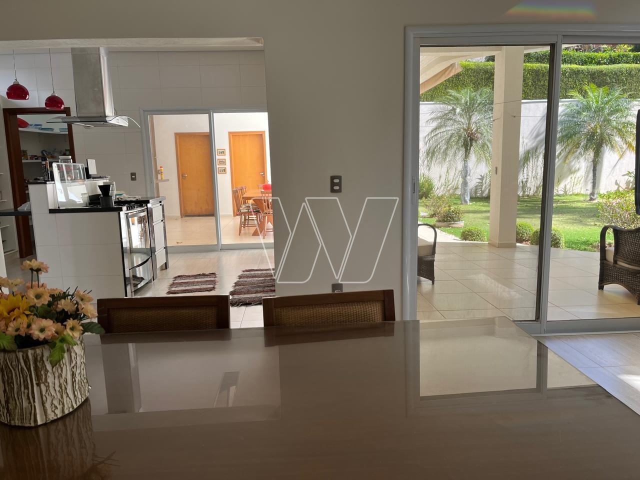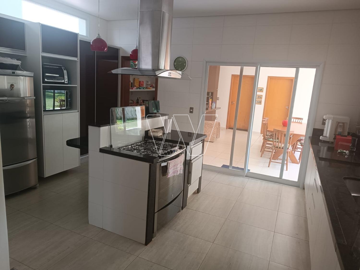 Área gourmet coberta anexa à cozinha, com linda bancada em "L" , aparador em granito, ótima churrasqueira e bancada com armários e pia. Toldo retrátil, mesa de jantar artesanal para 8 lugares. Banheiro completo.