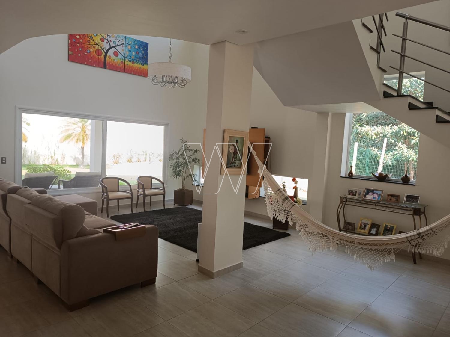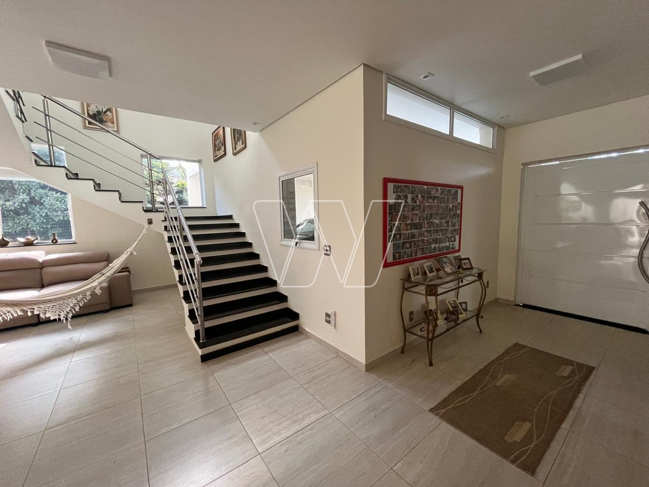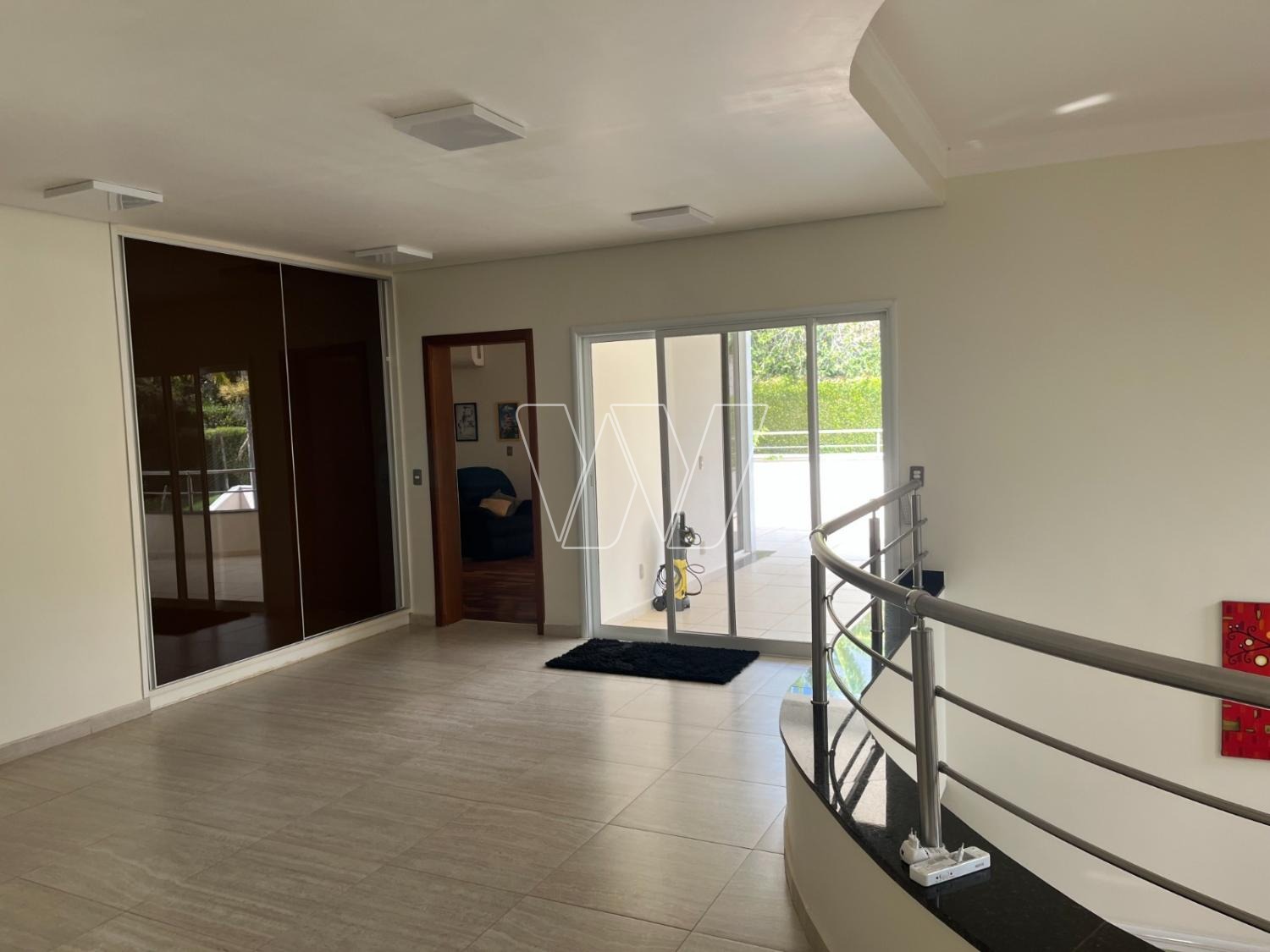PISO SUPERIOR: com escada em granito preto e guarda-corpo em aço inox. Hall da família amplo com ótima varanda interna. São 4 amplos dormitórios, todos com ar Split interverter quente/frio, ricos em armários.