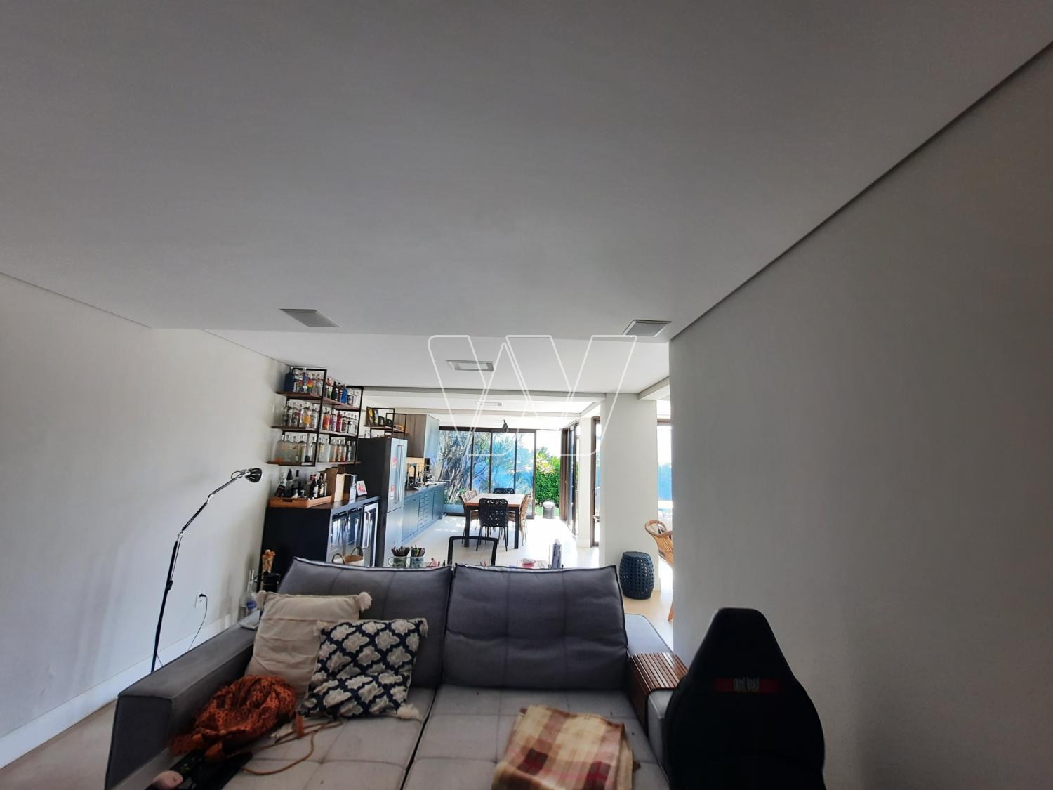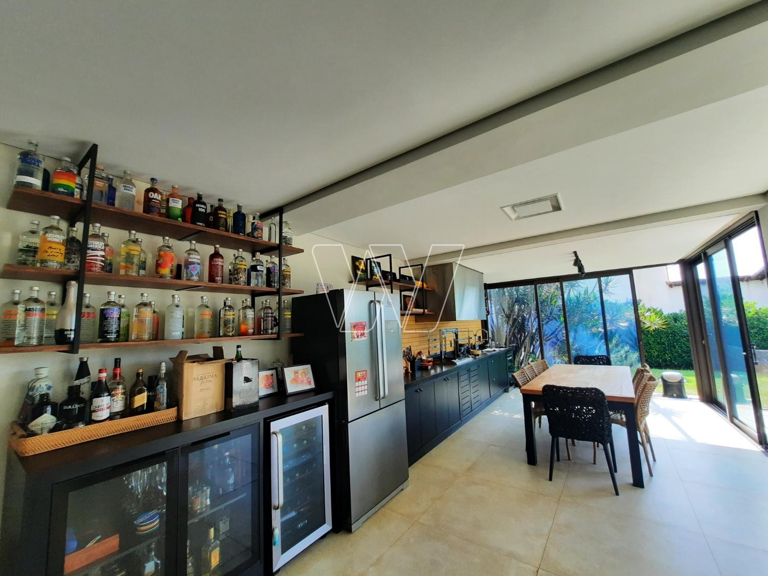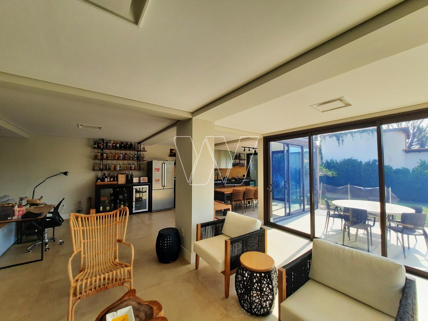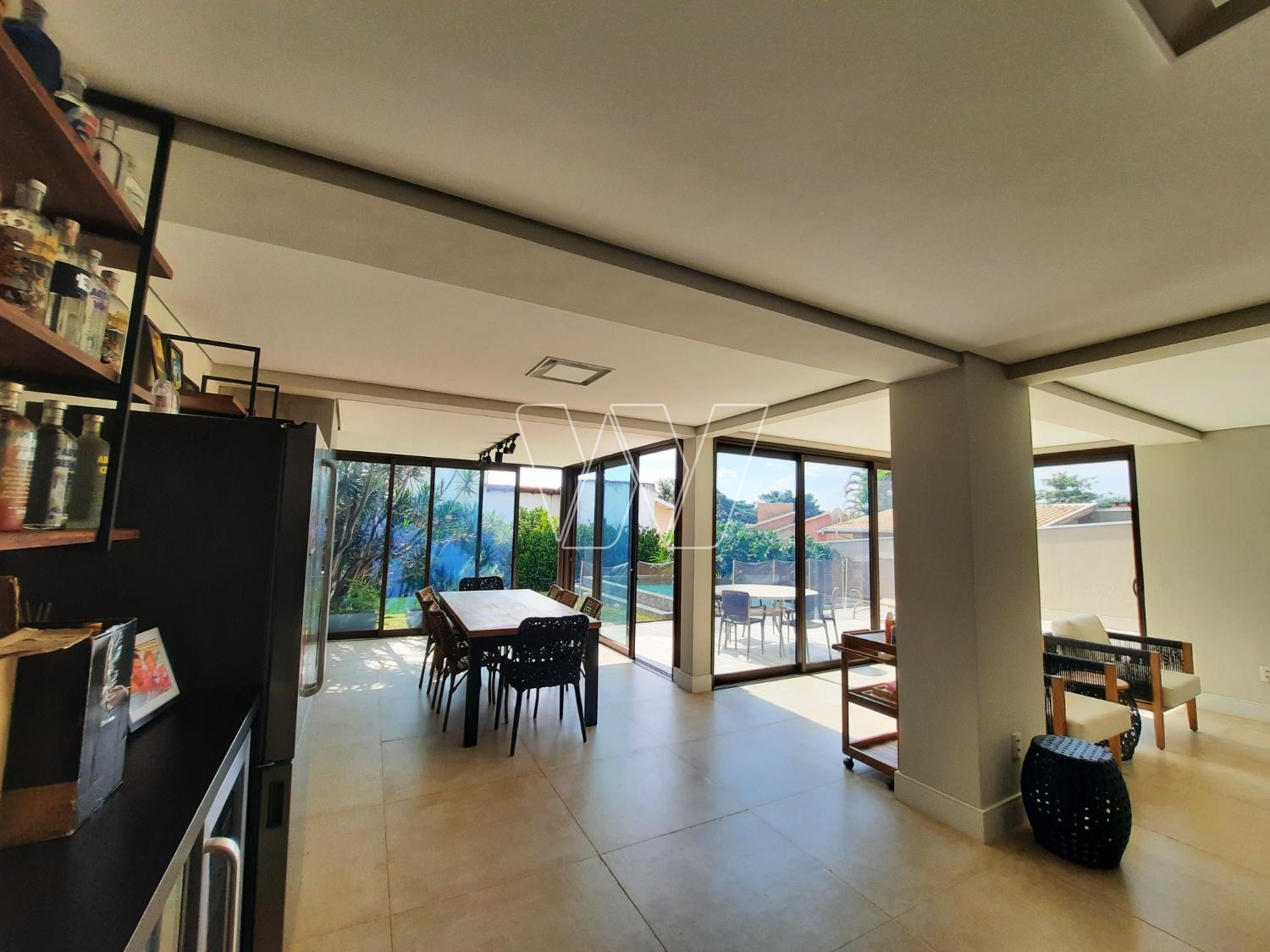 PISO INFERIOR: enorme área de lazer com churrasqueira e bem servida de gabinetes e prateleiras; grande área envidraçada com portas de correr para acesso á piscina. Home theater com lareira, banheiro de apoio e quarto de depósito que pode ser utilizado como quinto quarto para hóspede. Mais a lavanderia e banheiro de serviço,