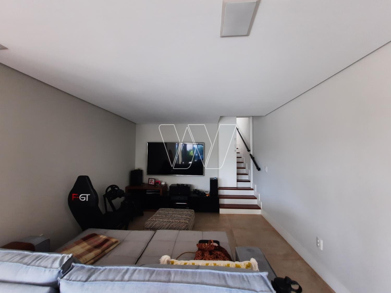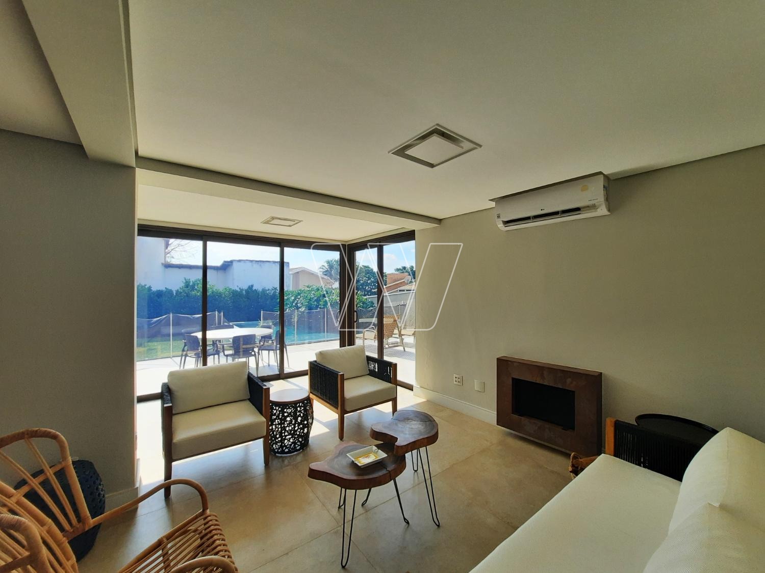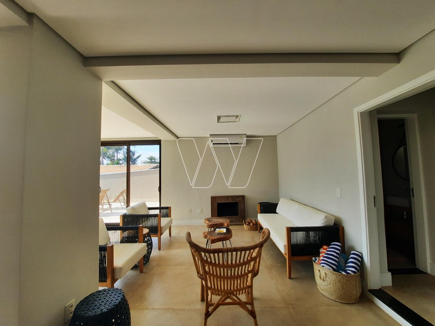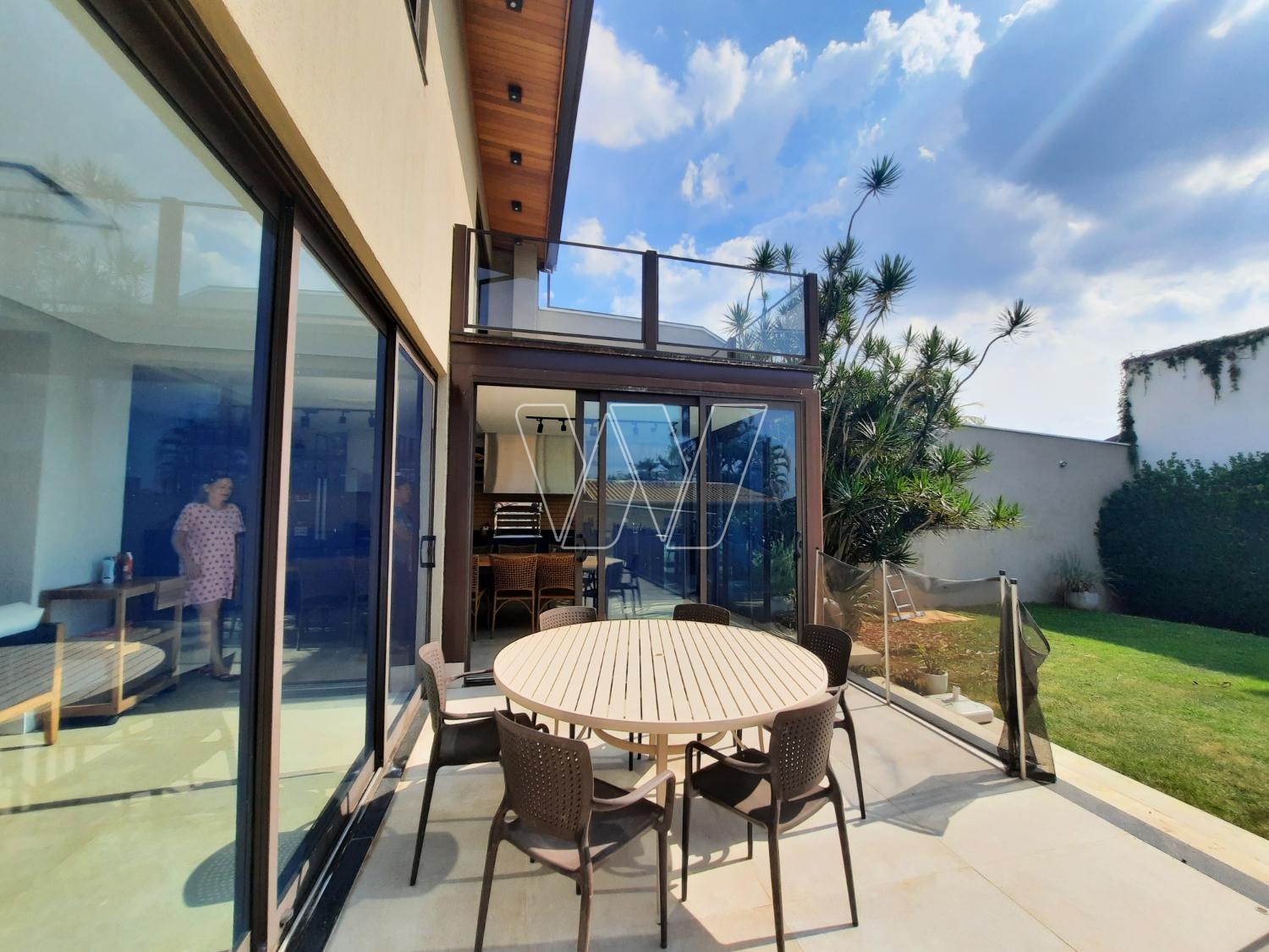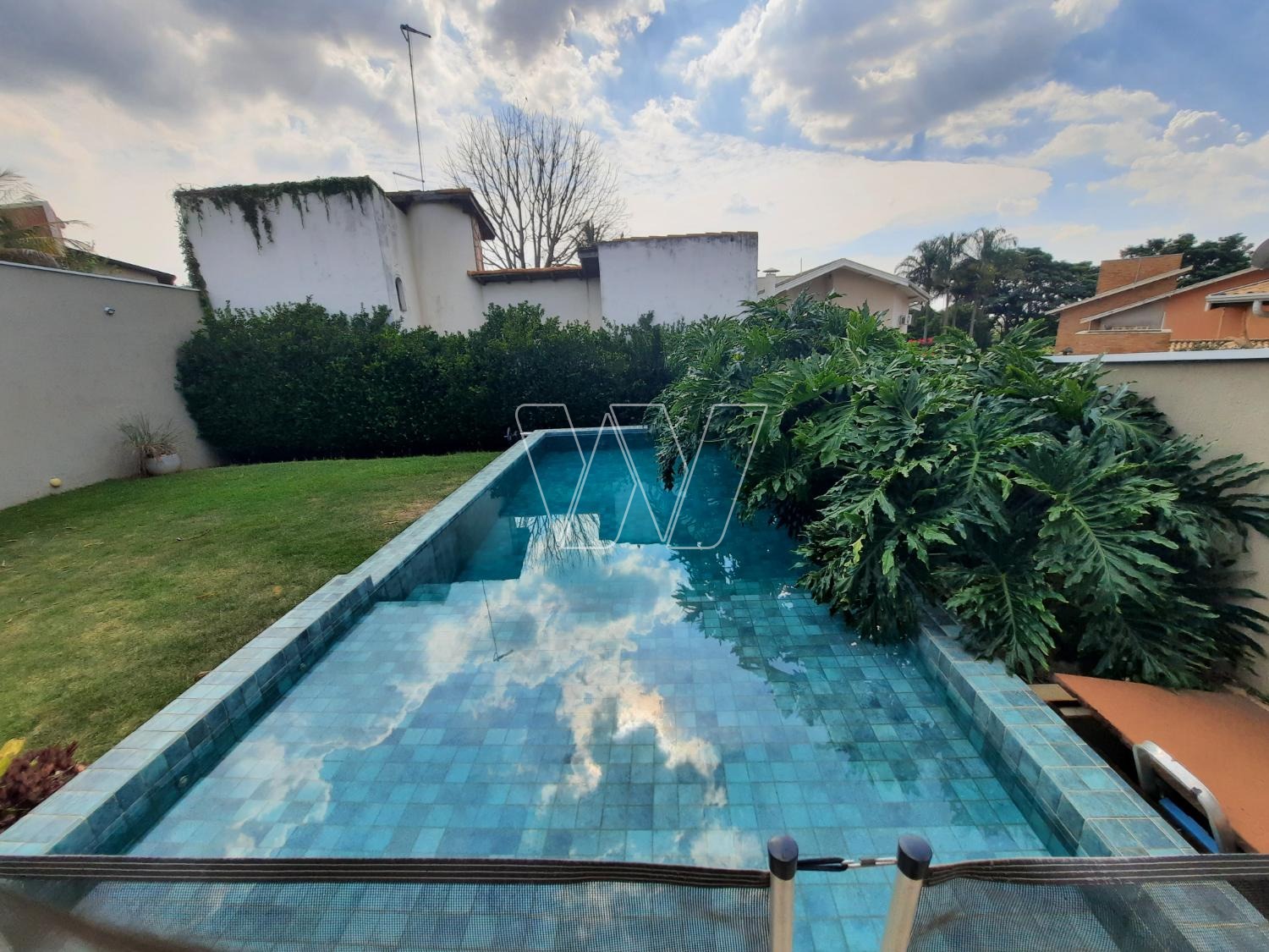 PISO INFERIOR: enorme área de lazer com churrasqueira e bem servida de gabinetes e prateleiras; grande área envidraçada com portas de correr para acesso á piscina. Home theater com lareira, banheiro de apoio e quarto de depósito que pode ser utilizado como quinto quarto para hóspede. Mais a lavanderia e banheiro de serviço,