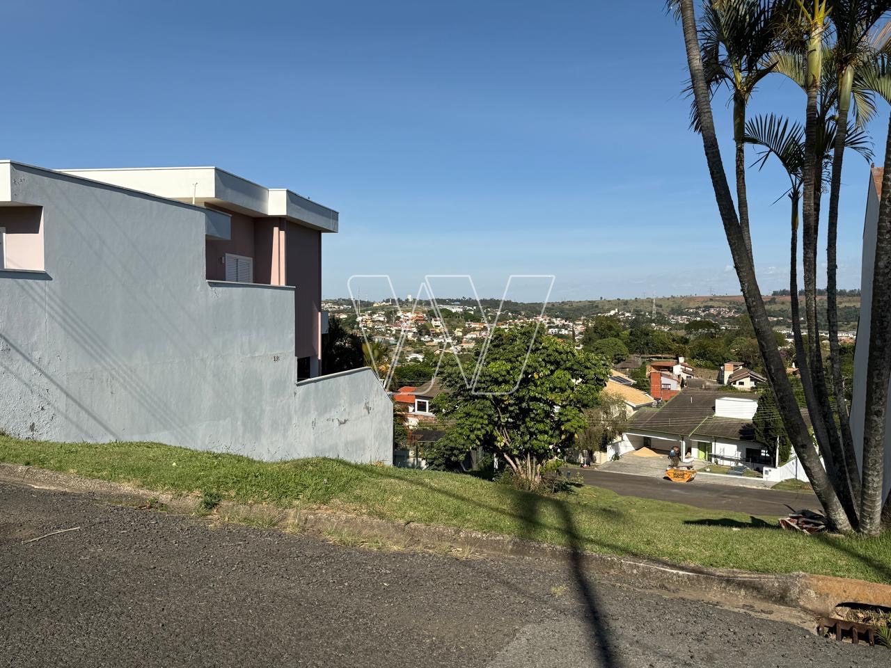 Terreno em declive/aclive, com metragem de total de 493m², em rua tranquila, bem no miolo do condomínio. Localiza-se no meio da quadra.
